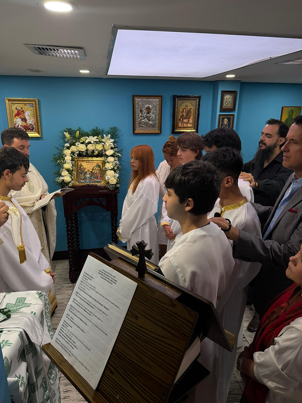 Al día siguiente, domingo, la solemnidad se trasladó al íntimo espacio de la casa-capilla en Bello para celebrar la Divina Liturgia de la Epifanía. Pero esta liturgia tuvo un protagonista especial: seis jóvenes que, tras meses de preparación en el curso de catequesis, estaban listos para dar el paso definitivo. Sus nombres resonaron con una fuerza nueva: Esteban, como el primer mártir; Santiago, como el primer obispo de la Iglesia en Jerusalén; Esteban (otro…), Justin; como nuestro amado San Justin Popović; y Joaquín y Ana, en honor a los progenitores de nuestra soberana Theotokos María.
